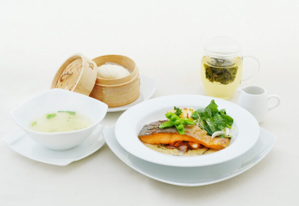 龍井茶の濃厚なクリームソースにピリ辛のモロッコ風ラタトゥイユ、皮をパリッと焼き上げたサーモンを重ね、ハーフサラダ、フランスのじゃがいも料理 ポムアンナを添えました。